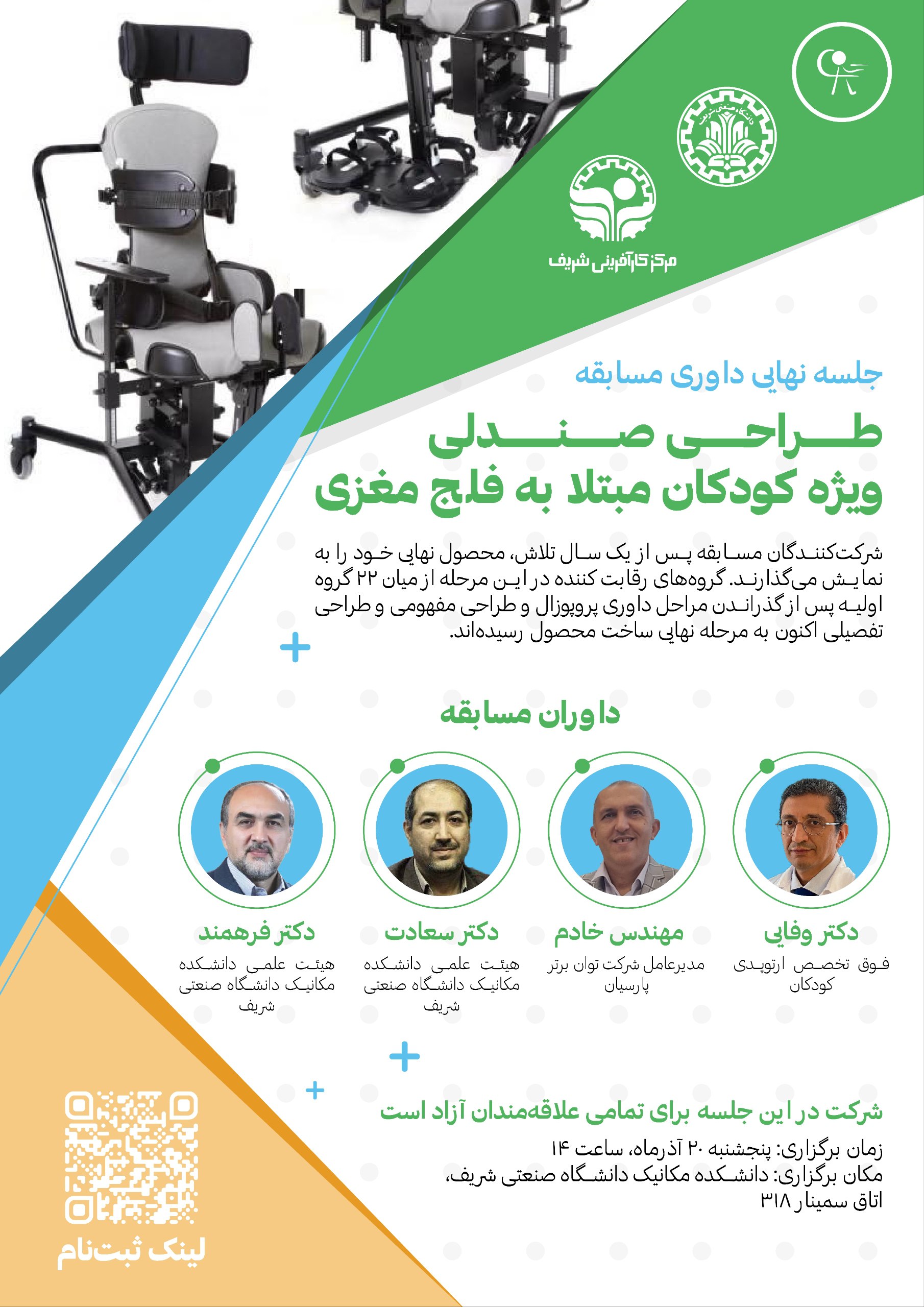 جلسهٔ داوری نهایی مسابقهٔ طراحی صندلی ویژه کودکان مبتلا به فلج مغزی | معاونت فرهنگی اجتماعی دانشگاه صنعتی شریف