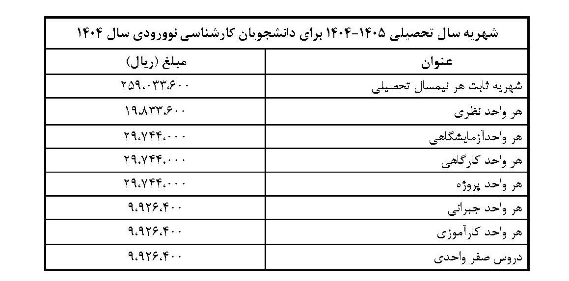 جدول شهریه هر نیمسال براساس اعلام مراجع ذیصلاح پردیس مشخص میشود و مبنای محاسبه شهریه خواهد بود.