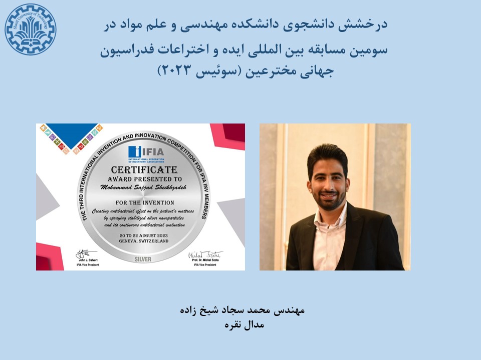 افتخارآفرینی دانشجوی دانشکده در مسابقات بین المللی آقای مهندس محمد سجاد شیخ زاده دانشجوی مقطع کارشناسی ارشد دانشکده مهندسی و علم مواد موفق به کسب مدال نقره در "سومین مسابقه بین المللی ایده و...