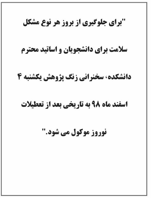 برای جلوگیری از بروز هر گونه مشکل سلامت برای دانشجویان و اساتید محترم دانشکده ، سخنرانی زنگ پژوهش روز یکشنبه 4 اسفند 1398 به تاریخی بعد از تعطیلات نوروز موکول می شود.