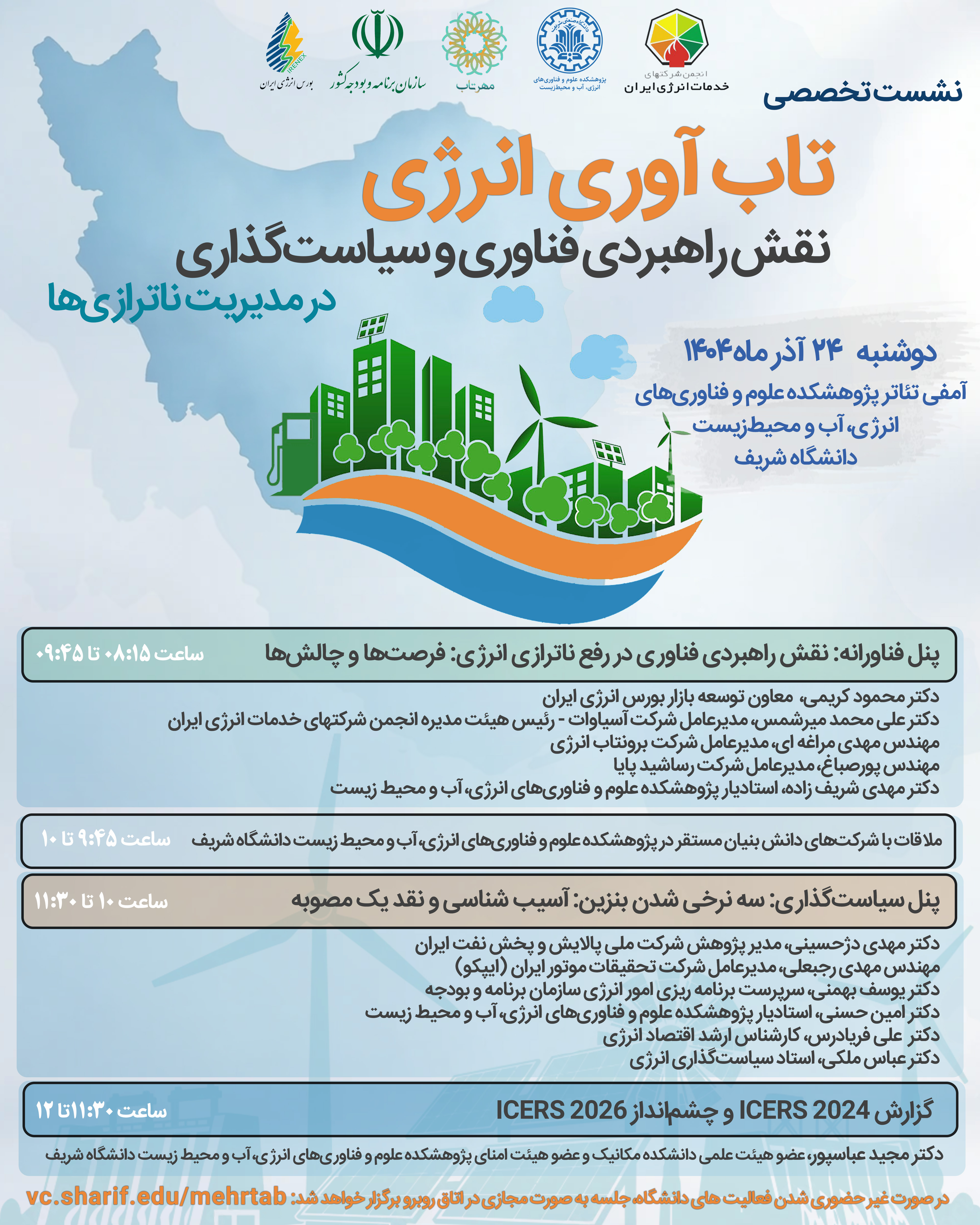 زمان: دوشنبه 24 آذرماه محل برگزاری: آمفی تتاتر پژوهشکده علوم و فناوریهای انرژی، آب و محیطزیست دانشگاه شریف