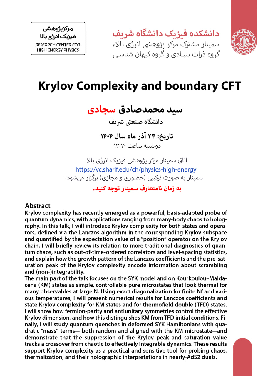 سمینارهای هفتگی مرکز پژوهشی فیزیک انرژی بالا Krylov Complexity and Boundary CFT سخنران: سید...