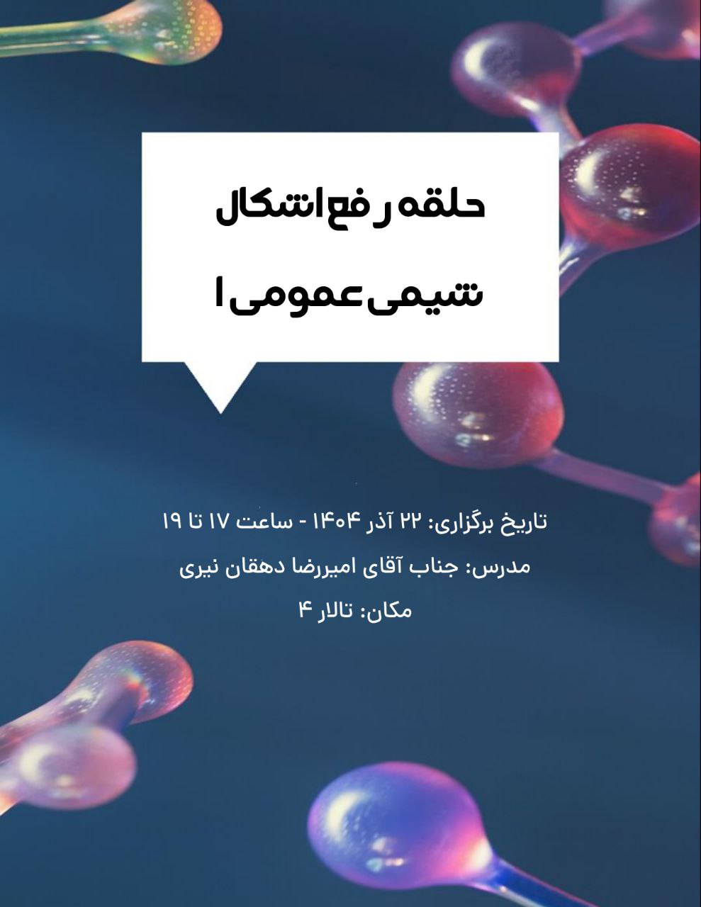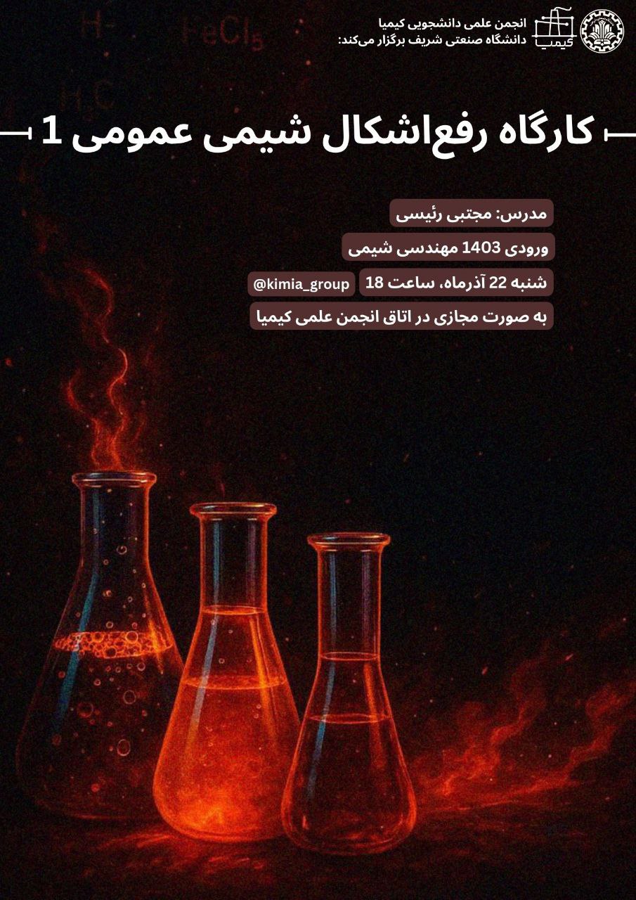 📢انجمن علمی دانشجویی کیمیا برگزار میکند: 🧪 کارگاه رفعاشکال شیمی عمومی ۱ 👤 مدرس: مجتبی رئیسی...