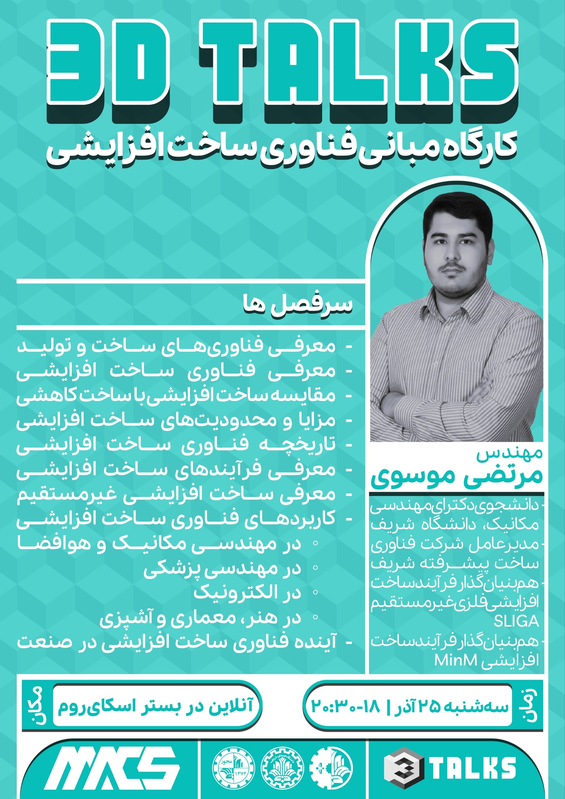 📰 یک روز پیش از برگزاری 3DTalks، کارگاه مجازی با موضوع «آشنایی با مبانی ساخت افزایشی» برگزار میشود. این سمینار توسط مهندس موسوی، نائب دبیر علمی رویداد، ارائه خواهد شد و شما را برای دریافت مطالب اصلی آماده میکند.