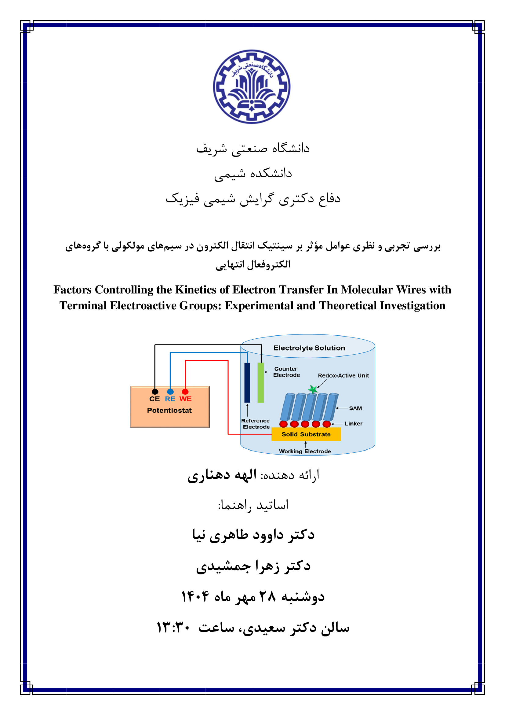 دفاع دکتری گرایش شیمی فیزیک بررسی تجربی و نظری عوامل موثر بر سینتیک انتقال الکترون در سیم های مولکولی با گروه های الکتروفعال انتهایی بررسی تجربی و نظری عوامل موثر بر سینتیک انتقال الکترون در سیم...
