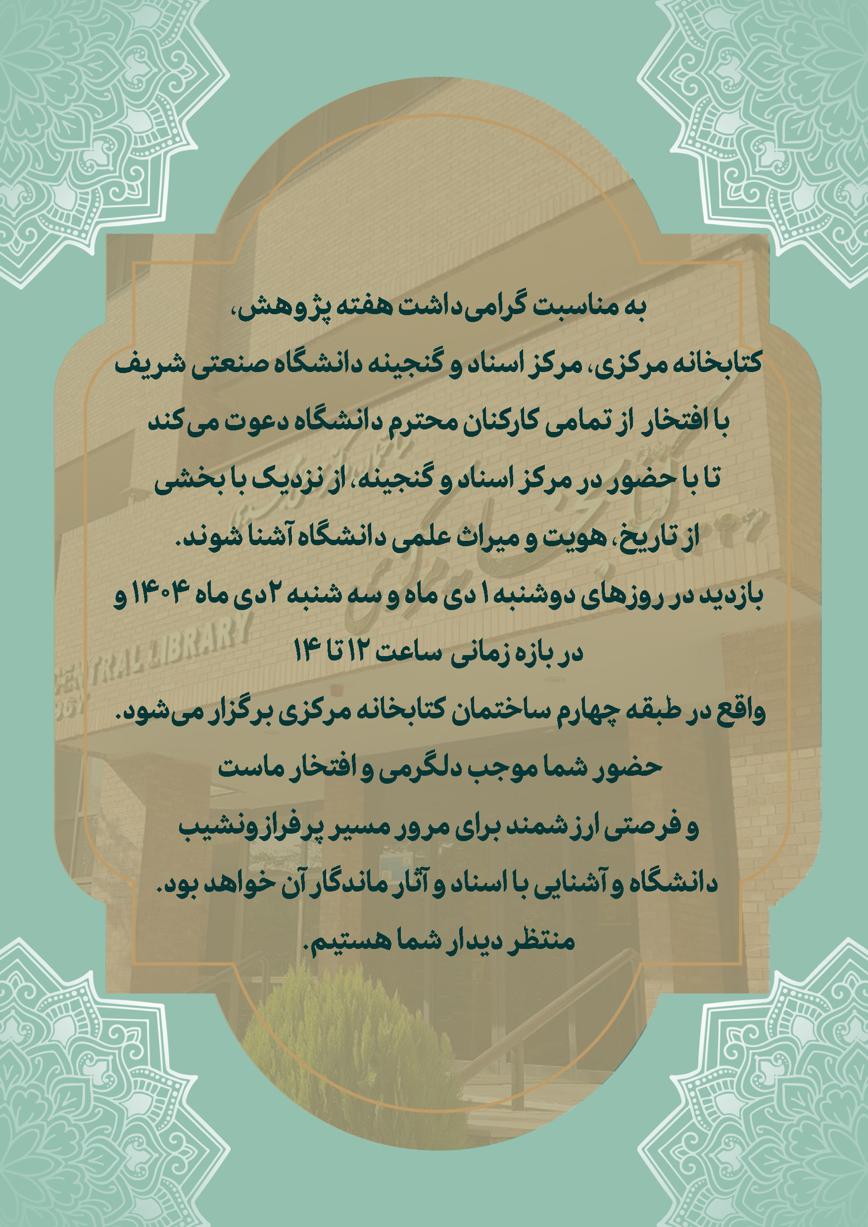 بازديد از مركز اسناد و گنجينه كتابخانه مركزی دانشگاه به مناسبت گرامیداشت هفته پژوهش، کتابخانه مرکزی، مرکز اسناد و گنجینه دانشگاه صنعتی شریف با افتخار از تمامی کارکنان محترم دانشگاه دعوت میکند تا...