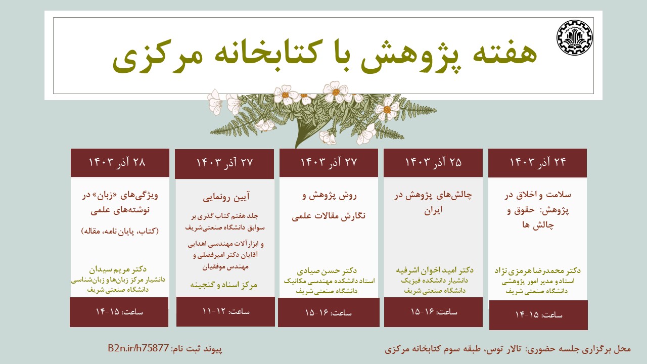 برنامههای كتابخانه مركزی در هفته پژوهش 1403 برنامههای كتابخانه مركزی در هفته پژوهش 1403 برنامههای كتابخانه مركزی در هفته پژوهش 1403 كتابخانه مركزی، مركز اسناد و گنجينه دانشگاه صنعتی شريف، امسال...