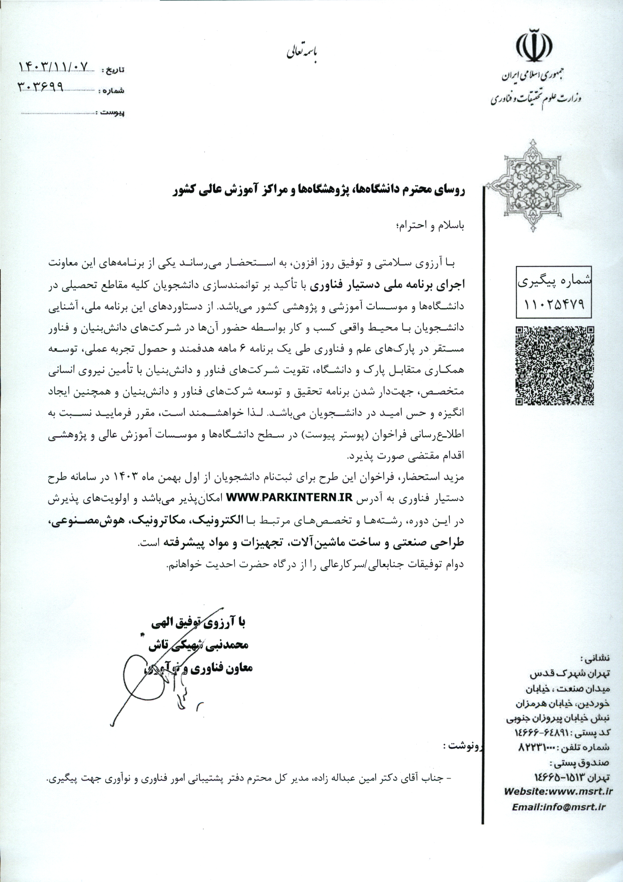 فراخوان این طرح جهت ثبت نام دانشجویان از اول بهمن ماه 1403 در سامانه طرح دستیار فناوری به آدرس  WWW.PARKINTERN.IR امکان پذیر است. شایان ذکر است الویت های پذیرش در این دوره، رشته ها و تخصص های مربتط با الکترونیک، هوش مصنوعی، طراحی صنعتی، ساخت ماشین آلات، تجهیزات و مواد پیشرفته می باشد.
