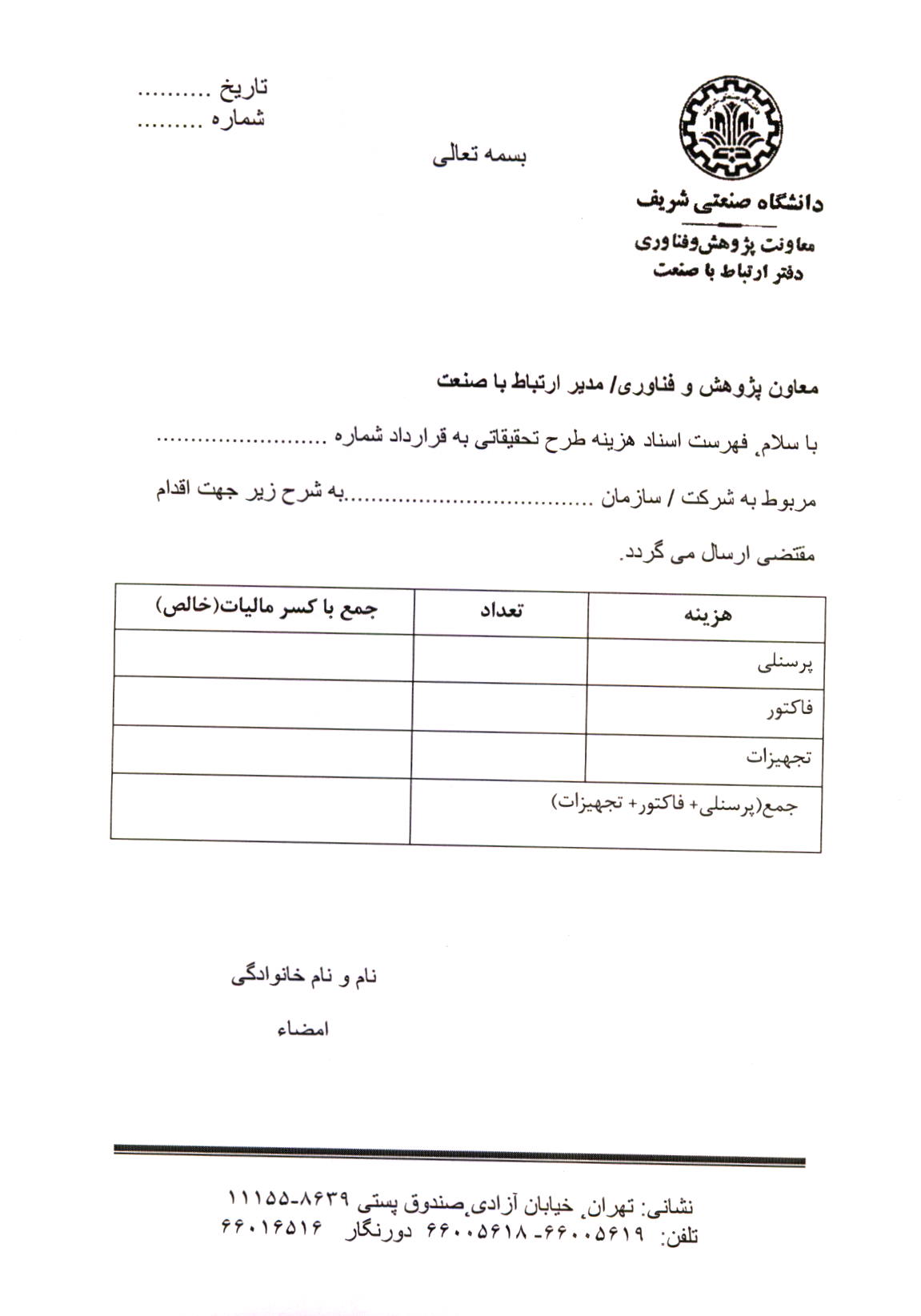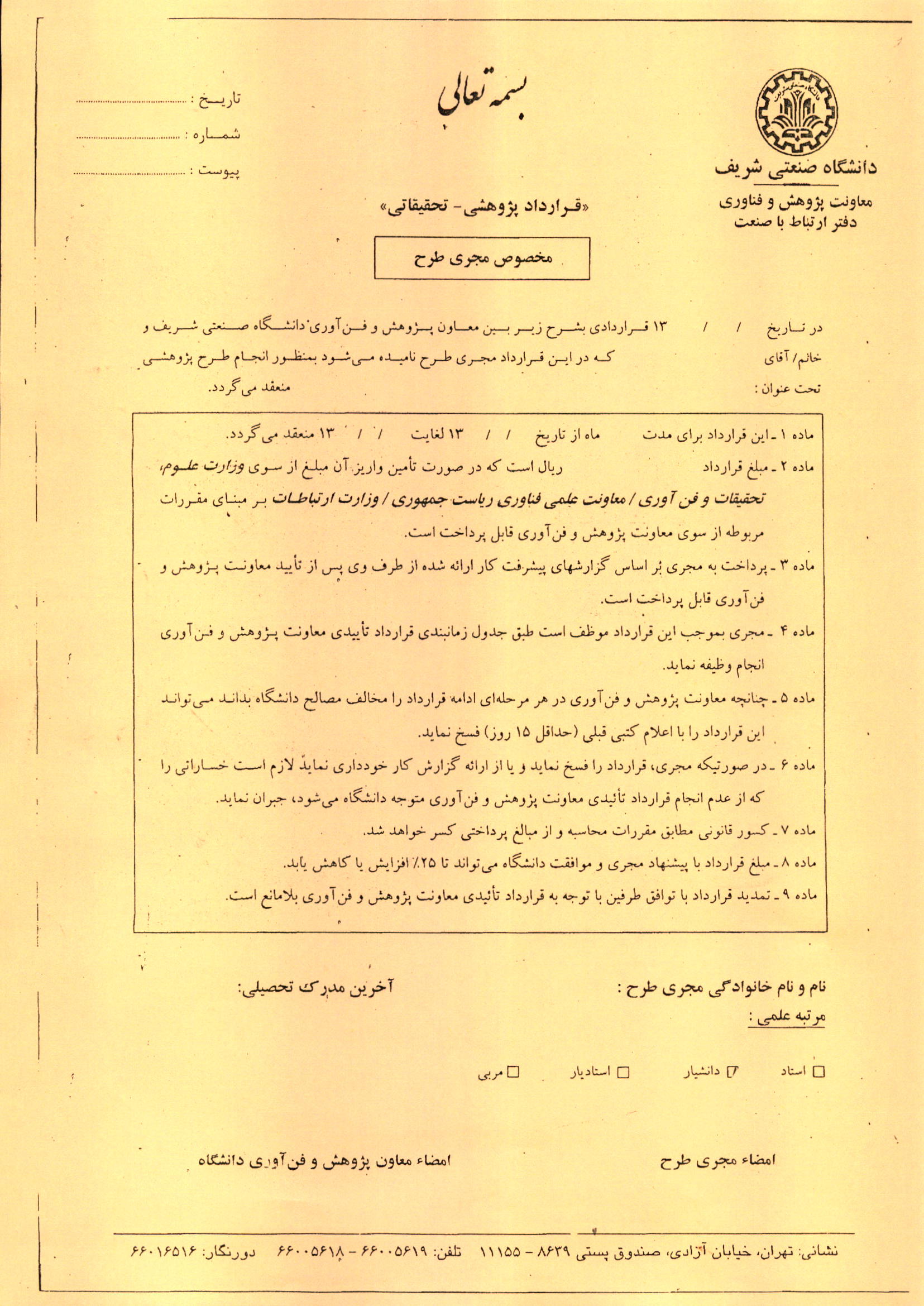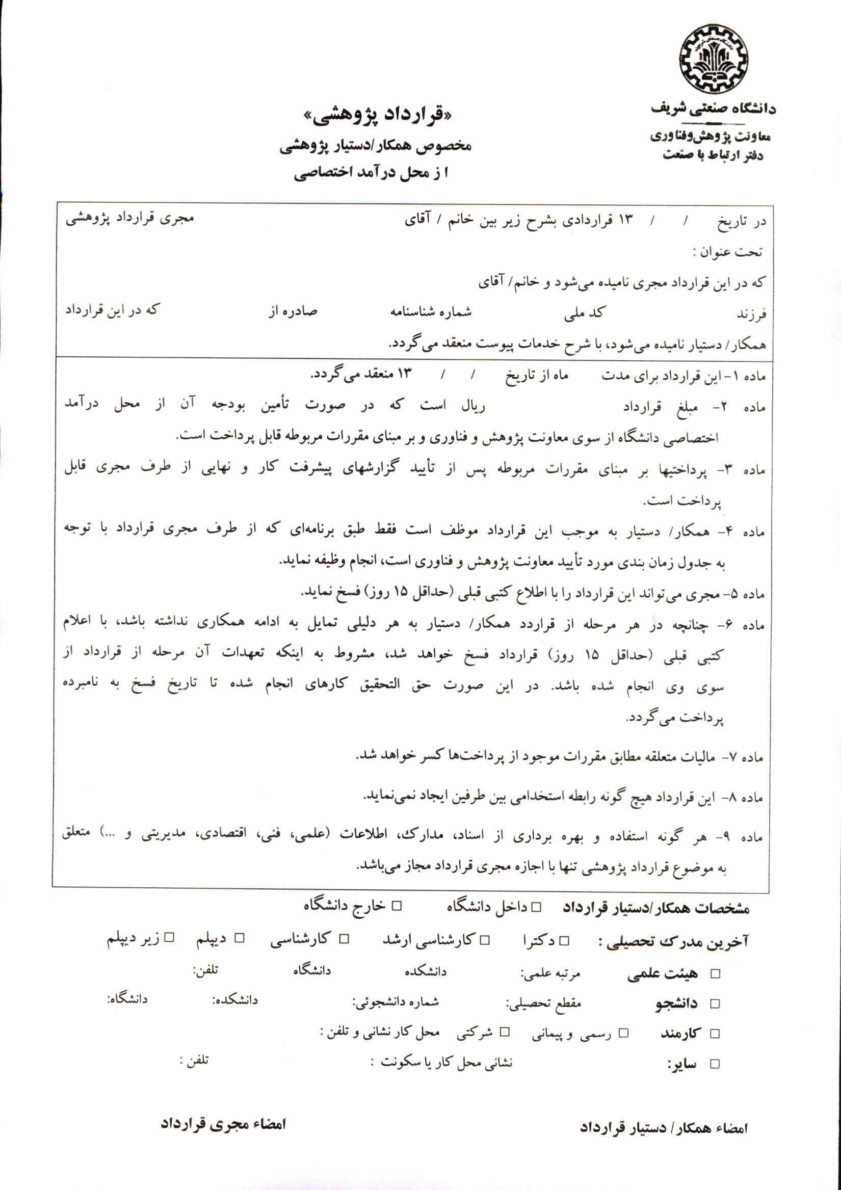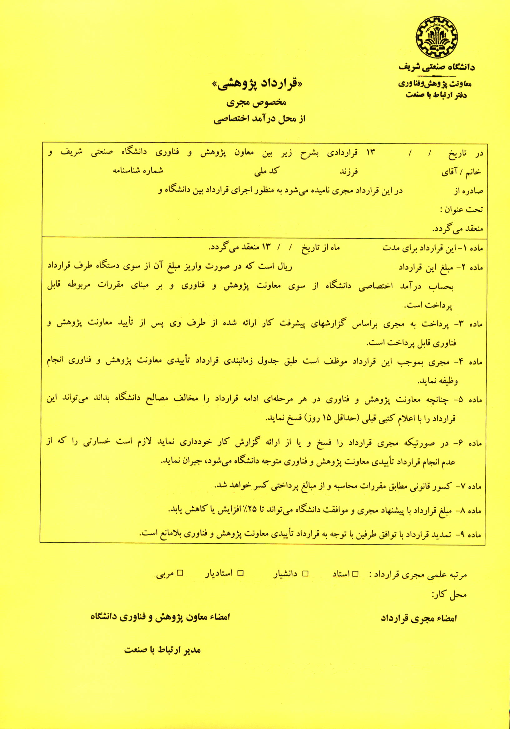 فرم خام قراردادهای ارتباط با صنعت